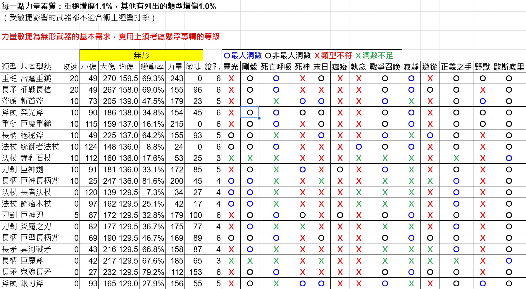 武器只列出無形雙手武器,並省略攻速偏快的部分