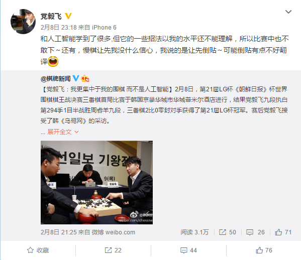 不過黨毅飛表示有些人工智慧弈出的招法以自己目前的水準還不能夠理解,在實戰中