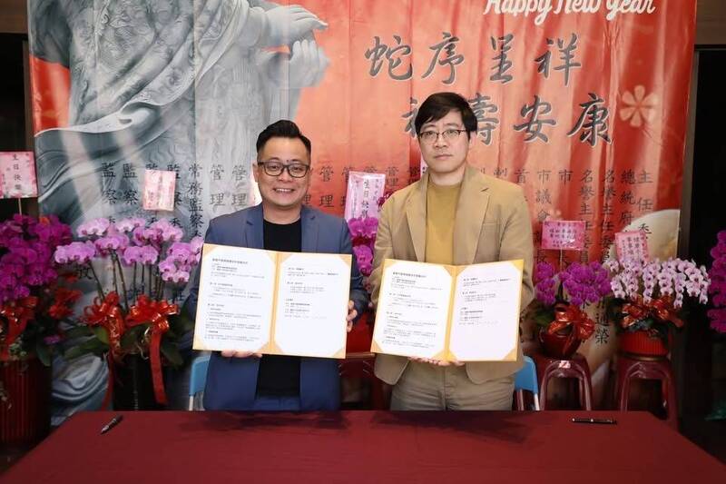 基圍會主委童子瑋(左)與圍棋人科技公司執行長林至涵(右)簽署合作協議。(圖為童