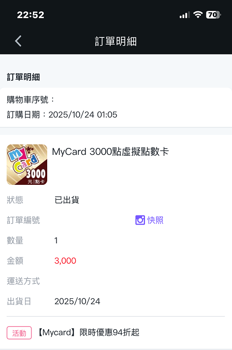 ★【物品名稱】:MyCard點數 3000*1 88折