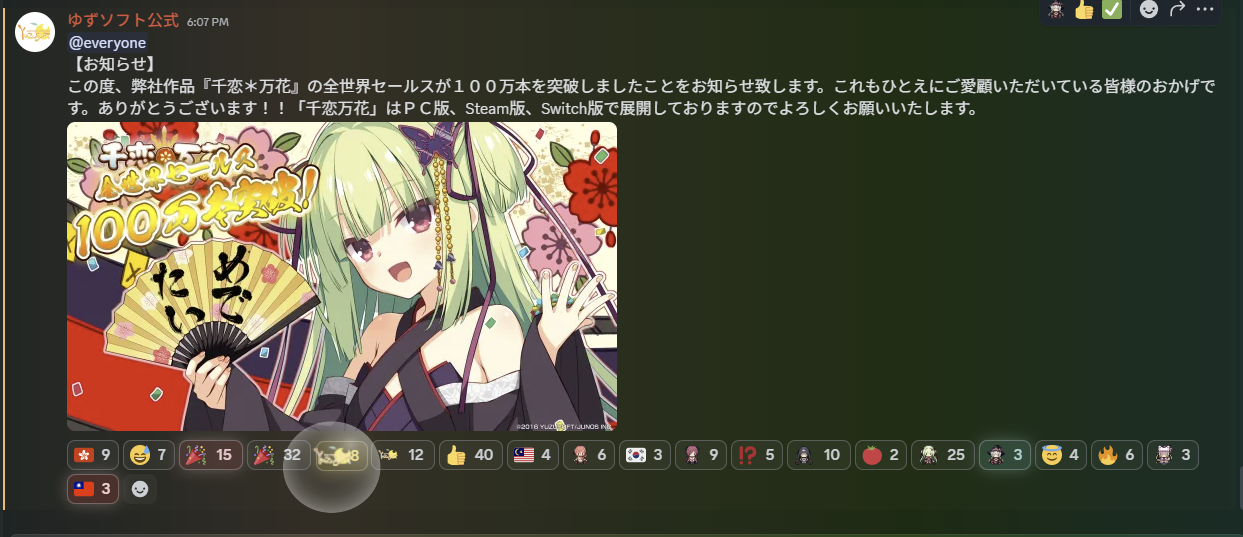 この度、弊社作品『千恋*万花』の全世界セールスが100万本を突破しましたことをお知らせ致します。これもひとえにご愛顧いただいている皆様のおかげです。ありがとうございます!!「千恋万花」はPC版、Steam版、Switch版で展開しておりますのでよろしくお願いいたします。