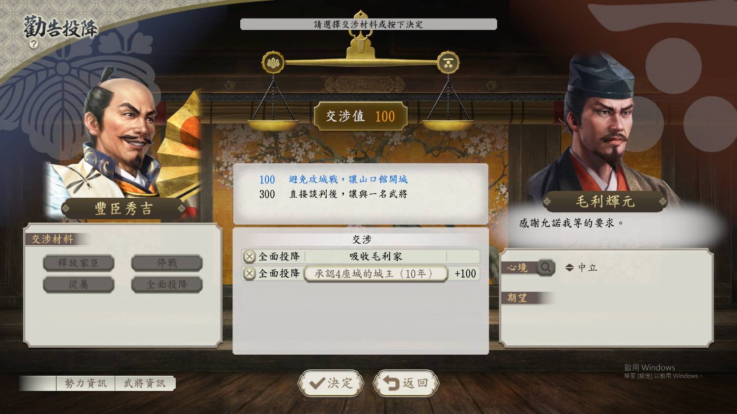 [新生] 勸降勢力的條件為何?