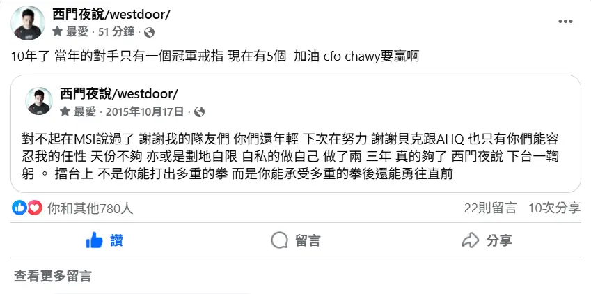 西門對前隊友CHAWY以及CFO打T1的祝福,