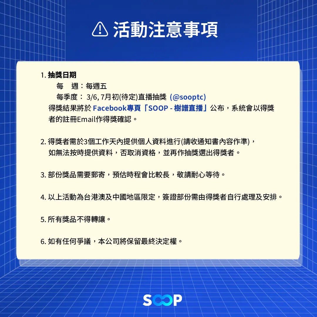 每場轉播隨機掉落抽獎券!