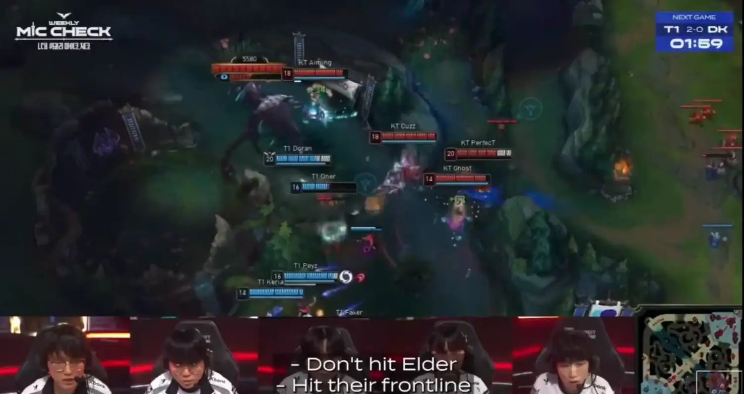 可以聽到KT雖然有喊別打遠古龍,但Aiming仍然在上面狂A遠古龍,最後讓Oner搶到。