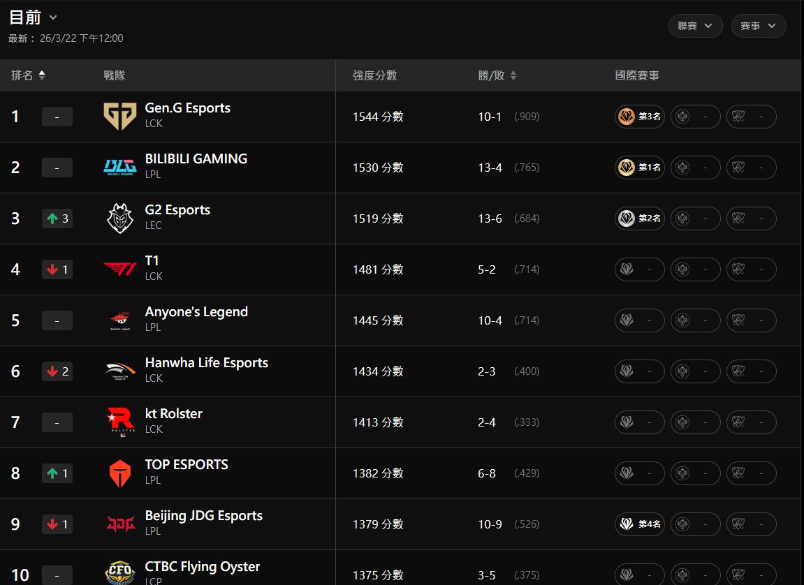 剛剛發現這次初陣對抗賽GENG被打個滿頭包積分還是世界第一,但T1掉出世界前三戰隊。