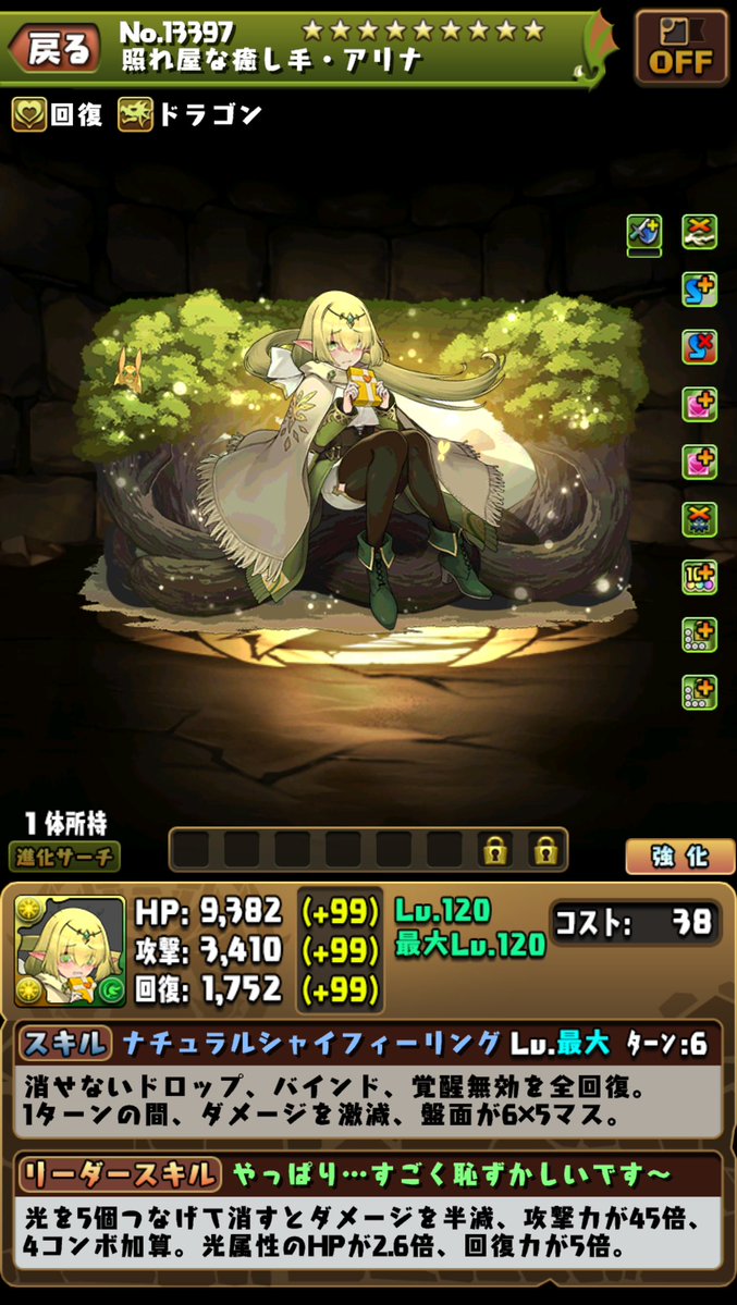 賦予角色覺醒:副屬性轉換為木屬性、7C+、木珠++、水珠++、2自回+、部位破壞。