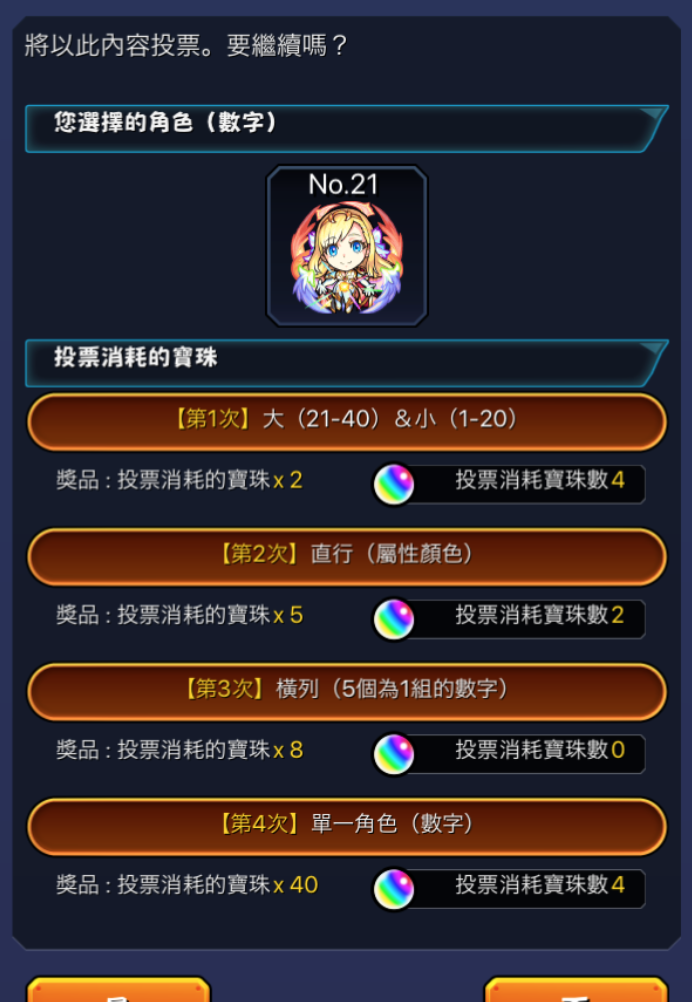只要在遊戲內選擇喜歡的1位角色(數字),在四次遊戲中投票選擇希望消耗的寶珠吧!