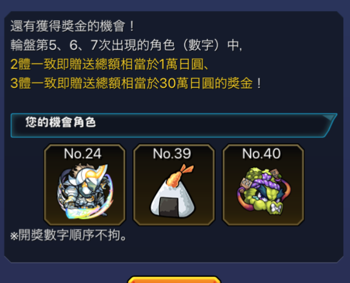 *不論順序,只要有2體角色或以上一致就能獲得獎金。