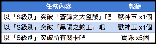 假如初次成功挑戰「黑陽之蛇王」和「蒼彈之大盜賊」,可各得到初次報酬「寶珠 x5個