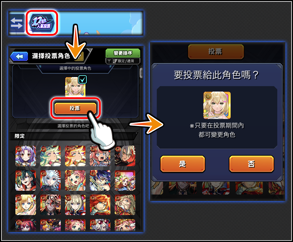 點擊「參加『選拔!12週年人氣投票轉蛋』投票活動吧!」圖示,選擇一位心愛的角色進