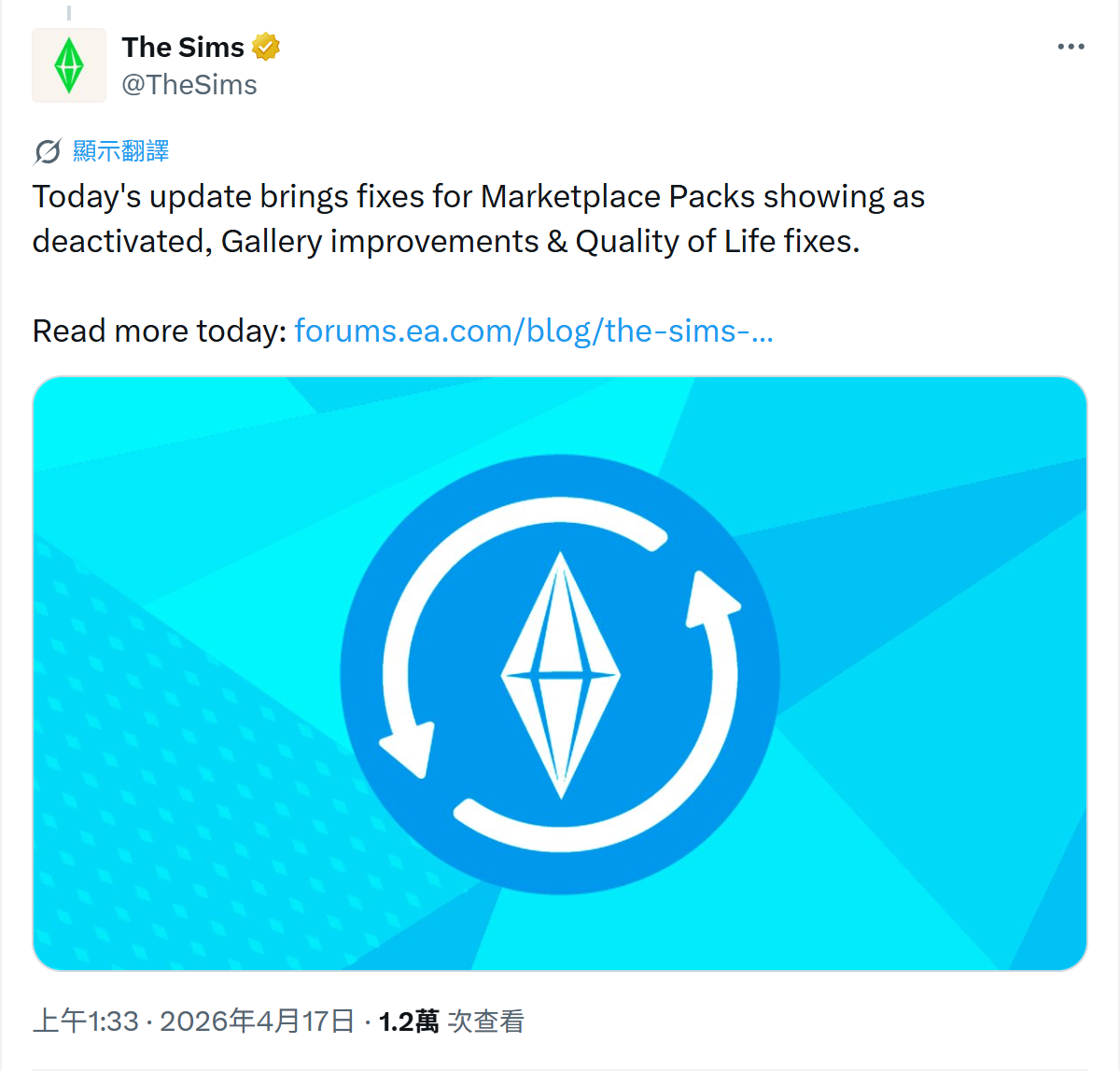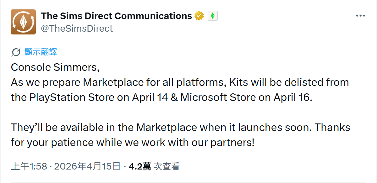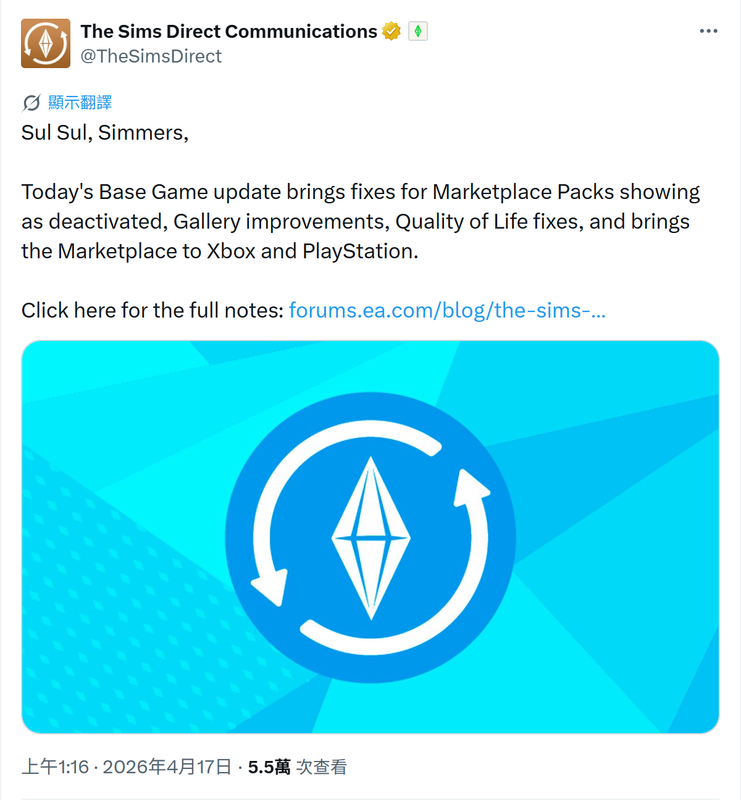 本次更新主要是讓主機補上前次 #1fkX7lqg (TheSims) 的 Marketplace 更新