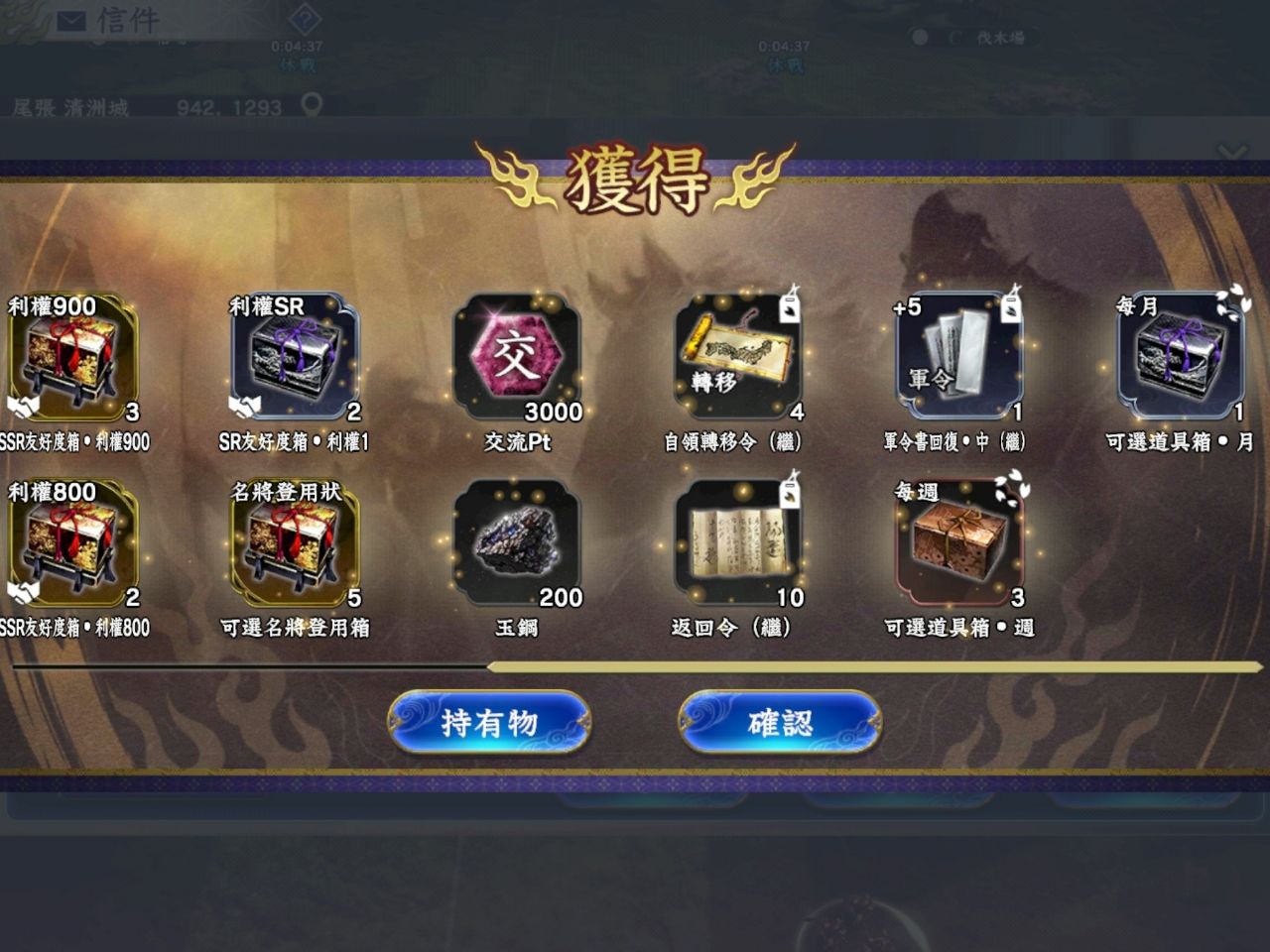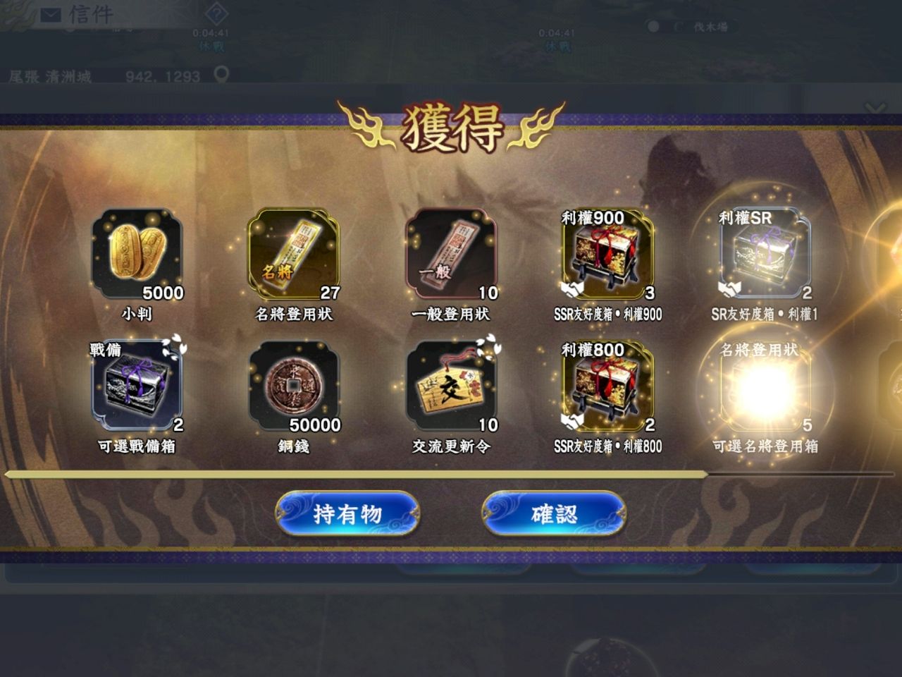 27日實況加S2發了不少東西,主要還是5000小判和27名將登用狀,以及一些道具。