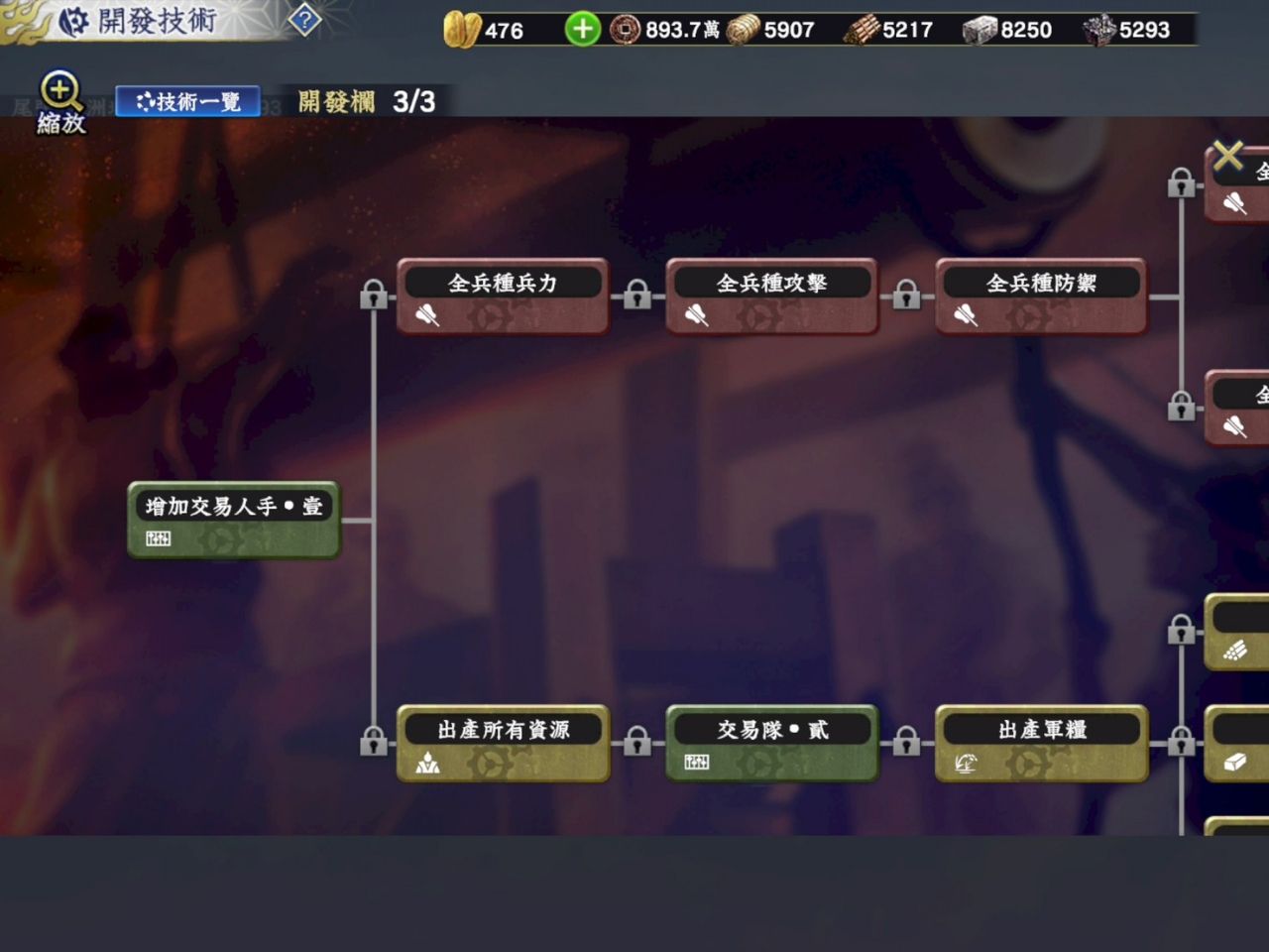 術,開發技術分為軍事和內政二大路線,之後也有小分支,而且會分時間分批鎖解之後的